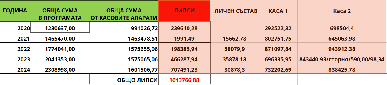 Прилагам обща снимка на таблицата за по-ясно разбиране на внесените според нашата система пари, според която става автоматичното менажиране на такситата и това за което е пусната касова бележка на трите касови апарата. Единия касов апарат на личен състав е пуснат по-късно в експлоатация и за това има празна графа за 2020 г.. Също така има 2 допълнителни снимки, за да се вижда по-ясно, какво е написано в таблицата.